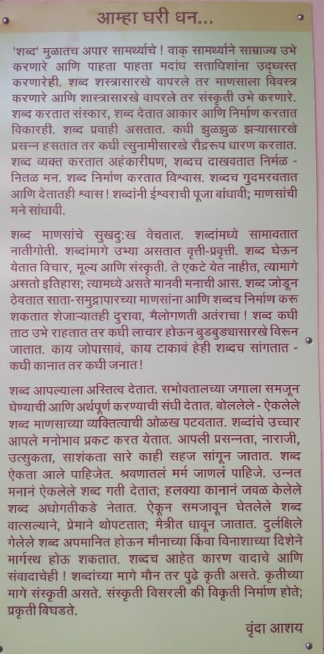 आम्हा घरी धन… या माझ्या ब्लॉग मधील ‘शब्द’ विषयक विचार मॅडमने शाळेतील ‘कवितांची बाग’ या भिंतीवर प्रदर्शित केलेले आहेत. मॅडम आपल्या या सृजनशील आणि संस्कारक्षम उपक्रमास हार्दिक शुभेच्छा!
